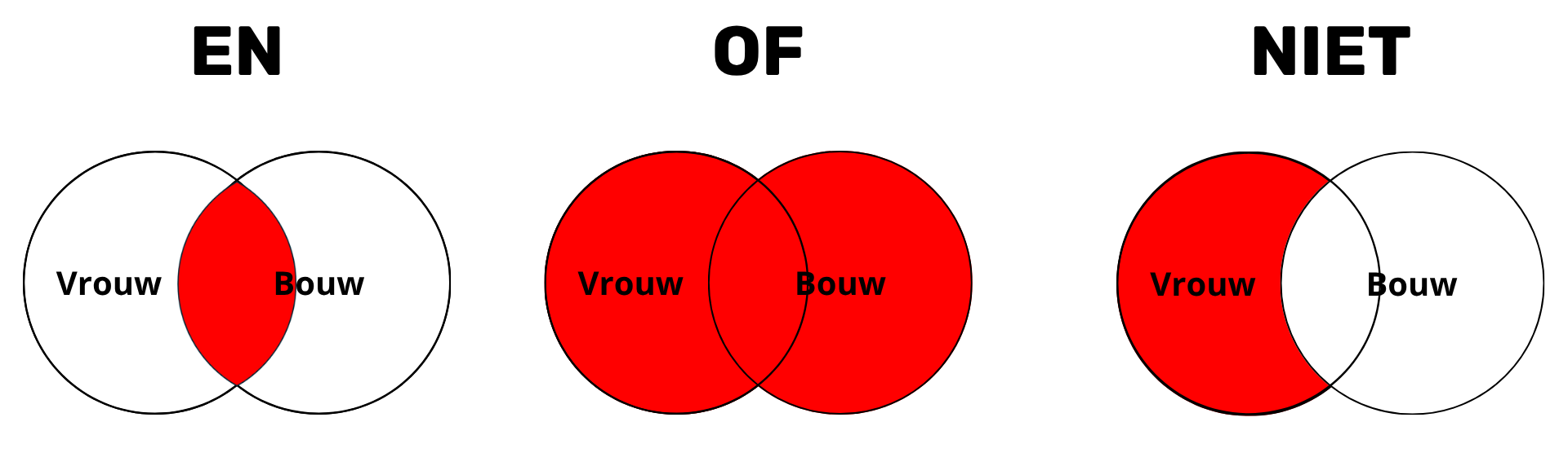 Booleaanse operatoren worden gebruikt om zoektermen op te nemen of uit te sluiten. Er zijn er drie: